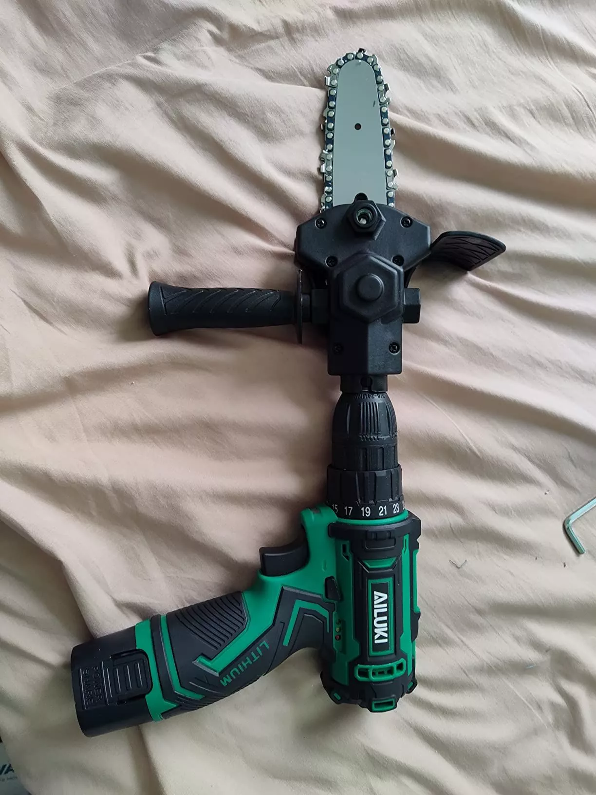 Absolutely thrilled with this Chainsaw Drill Attachment! It was incredibly easy to attach to my existing drill, and the transition from drill to chainsaw function is seamless. I used it for trimming branches in my backyard, and it worked like a charm. Saved me the cost of buying a separate chainsaw. A definite must-have for DIY enthusiasts