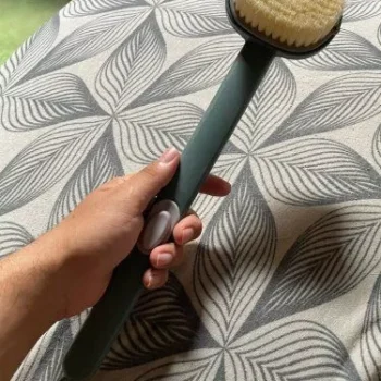 I had to write a review for this brush after 2.5 months of use – it's outstanding. Unlike the natural brushes I've tried before, which fell apart or grew mold, this one is holding up brilliantly. It's made from a high-tech polymer that shows no signs of mold. The handle is non-slip, even when soapy, and the bristles, while soft, provide a perfect scrubbing surface for the back