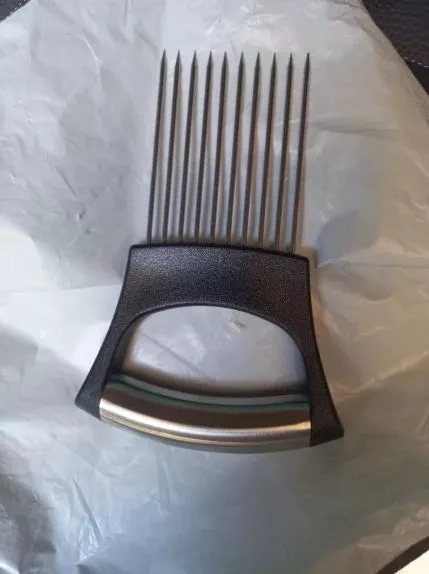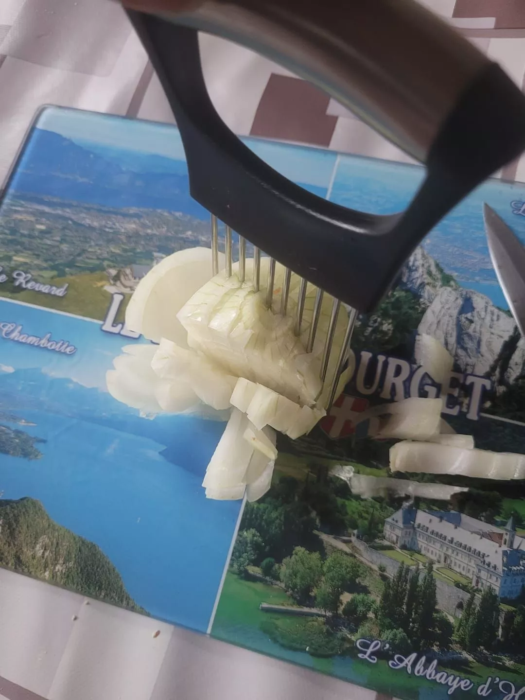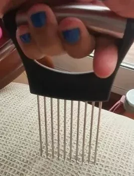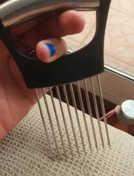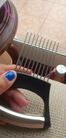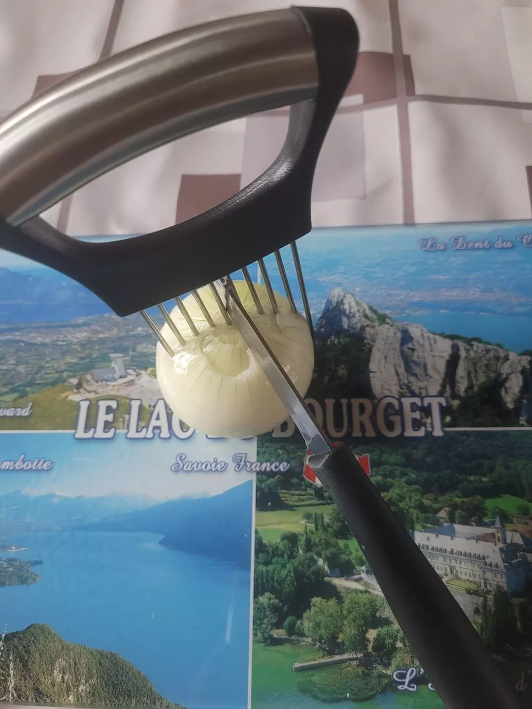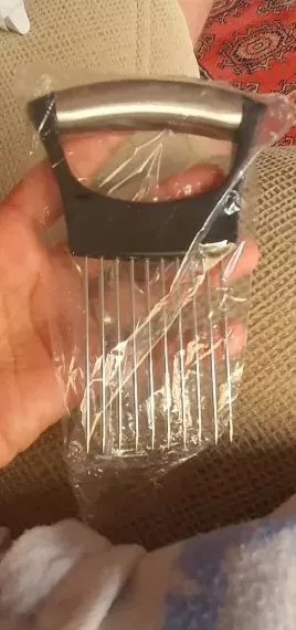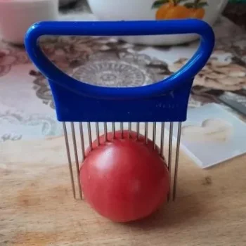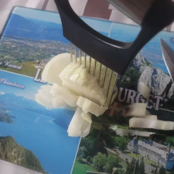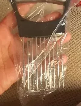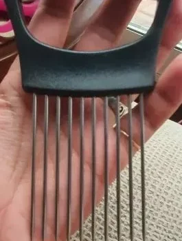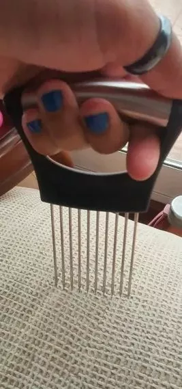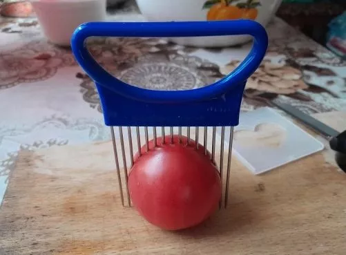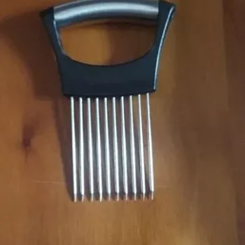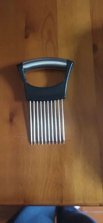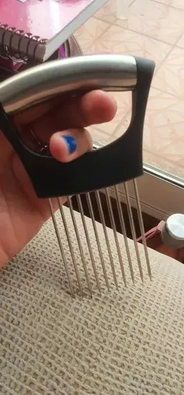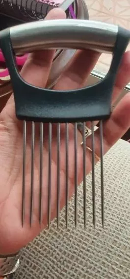 This holder is designed for heavy-duty use, and its larger needles make it sturdier than many others on the market. I've become so accustomed to using it that I use it all the time, not only for slicing onions but also for other vegetables. Additionally, the way it's designed keeps your fingers away from the knife blade, adding an extra layer of safety.